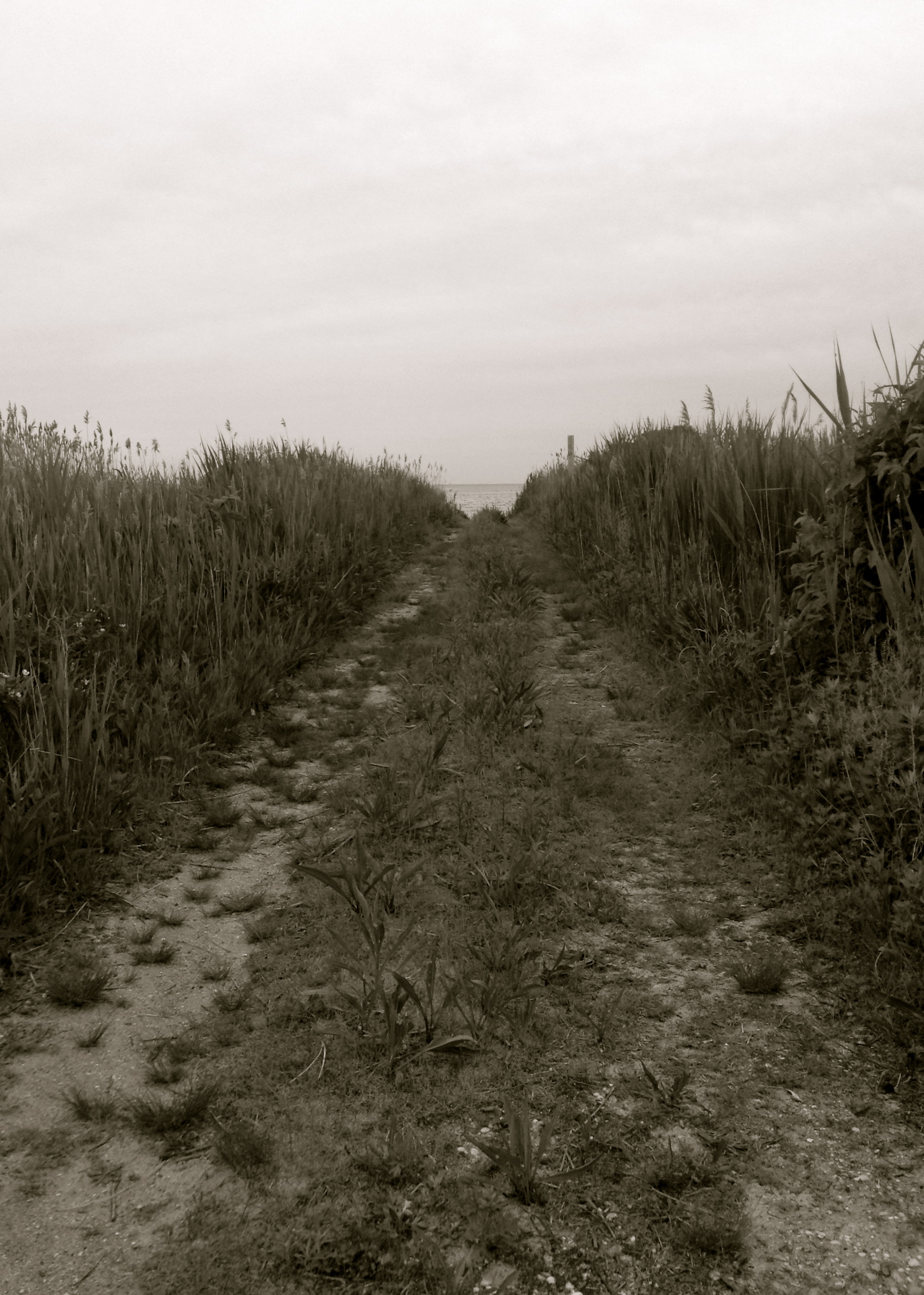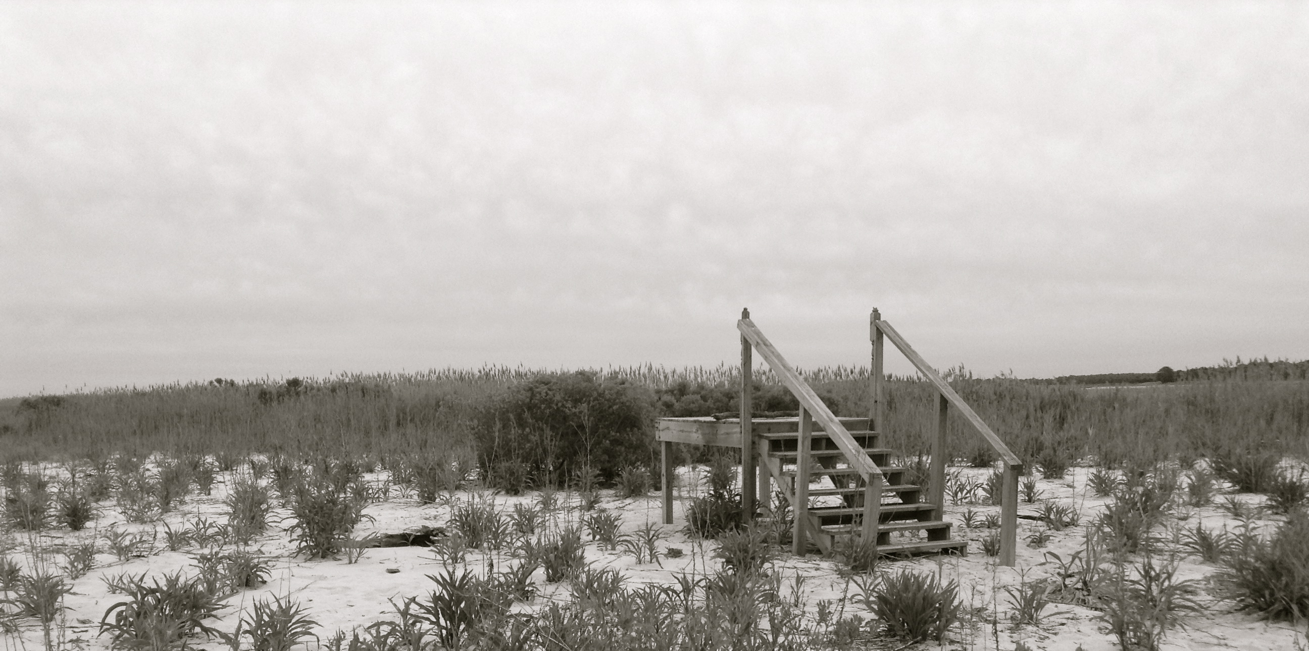 The sky is grey and there is no one around. The only sound to be heard is wind rustling through the plants. There are not even ocean sounds because the water is perfectly still, stagnant like a pond. I walk down to the beach and sit on a lonely set of stairs leading to nowhere. I feel as if I’m in a dream, a lonely dream, wandering purposelessly around an empty beach with no idea why I am here. My reverie is interrupted by a siren moaning from a distant coastal town. I recognize this sound from World War II movies: the air raid siren that heralds death and destruction. I feel a very strange mixed emotion of loneliness, vastness and now an unease that runs through my whole body as I sit on my purposeless staircase and wonder what this siren means. It stops after a minute and I’m left with just these mixed feelings and silence.