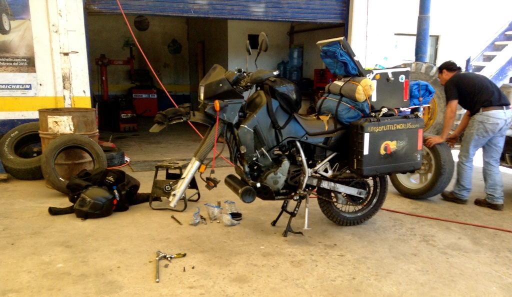 I asked some questions about the six used tires available and it was obvious the storekeeper knew nothing about motorcycles. I took a leap of faith in a knobby tire that looked the least worn out and that happened to fit. The tire wall read “not for highway use” but it was the best choice I had between my own worn tire and the other used dirt tires available. It was between surely having a flat in the middle of the desert or maybe having one. I payed the equivalent of thirty U.S. dollars, threw the tire over my shoulder and rode to the nearest “llantería”. I remembered that in the U.S., car tire shops were not legally allowed to work on motorcycle tires but I figured there wouldn’t be a problem here.