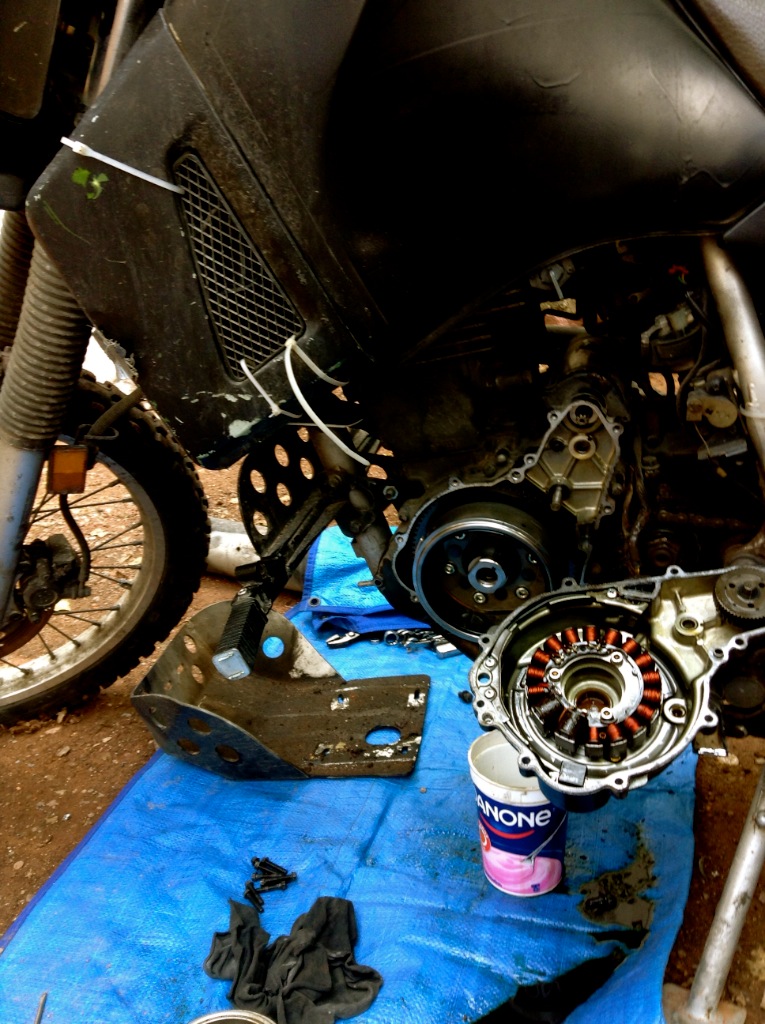 I get off the bike and walk over to the disassembled machine. There is a tarp on the floor with bolts, gears, bushings, tools and spilled oil upon it. Michel’s “workshop” consists of a plot of dirt in the open air, lined with old broken down bikes and old parts plus an air compressor tube hanging from the second story window. I look up to the sky and see dark clouds. It has rained everyday since I’ve been here and I want to put this all back together before the clouds let loose on the exposed innards of the bike.